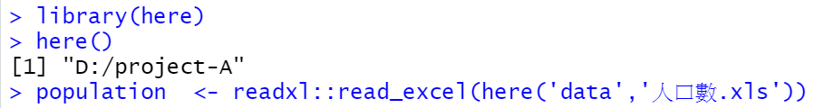 要讀取該「人口數」檔案,以here套件的用法如下