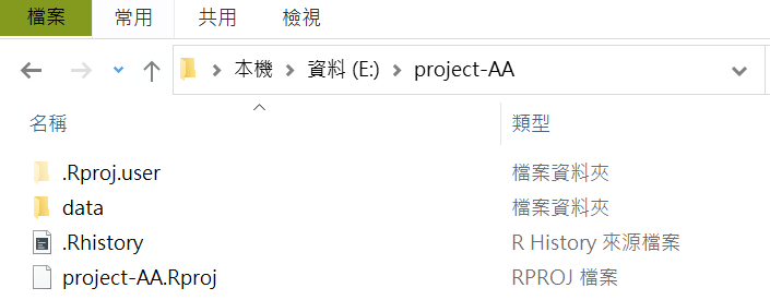 這樣若將此project複製給其他人,或者我們自己移動路徑,如將D磁碟的project-A改到E磁碟的project-AA,則只要使用RStudio建立新的project,目錄是在E磁碟,將用到的檔案複製到該project-AA底下,如圖所示,