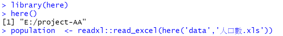 population <- readxl::read_excel(here('data','人口數.xls'))但從執行結果可看到,here()的目錄都已經是在E磁碟的project-AA,可說無痛移轉。