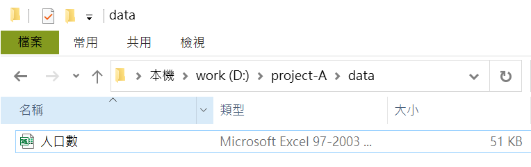 為解決上述問題,可以使用here套件。here是以project為運作基礎,在RStudio可新增project,指定project的目錄。例如,若在D磁碟有個project-A,其下有個data資料夾,在data資料夾中有個名稱為「人口數」的excel檔案,如下圖所示